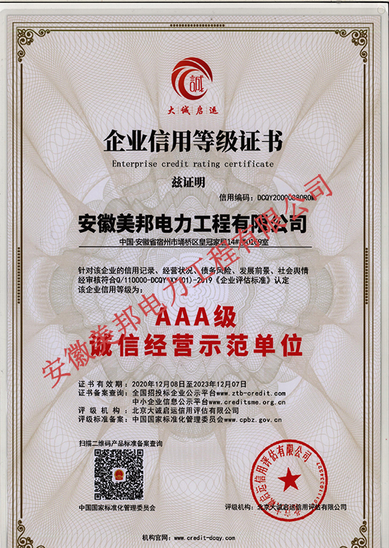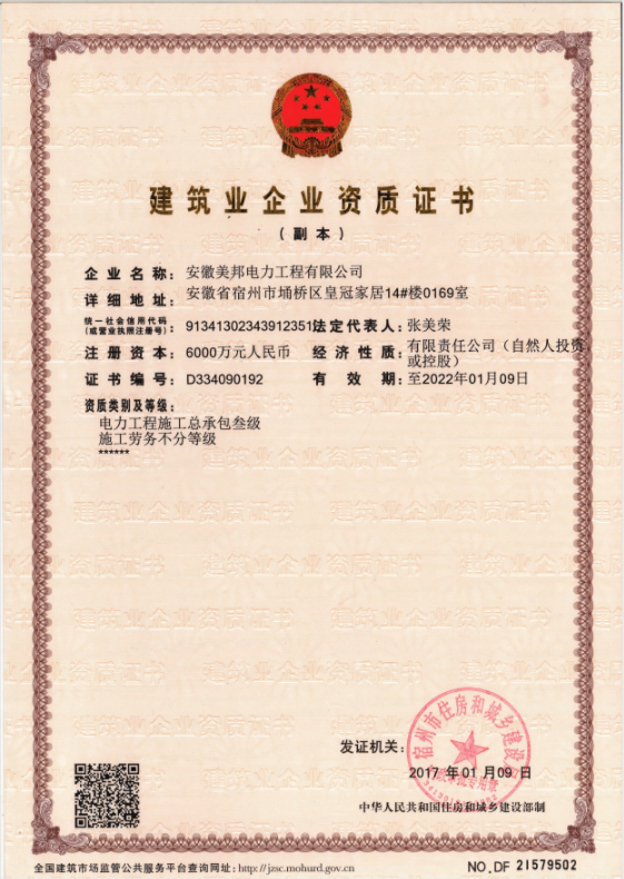 安徽美邦電力工程有限公司成立于2015年6月,坐落于宿州高新區。是一家從事電力工程設計、電力設備生產、電力工程施工、電力托管服務、電力工程搶險為一體的一站式綜合性公司。公司現有各類專業技術職稱的管理人員及大批從事電力工程專業施…